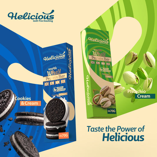 Helicious bars combine 24g of pure whey protein with zero added sugar and real ingredients for flavor that doesn’t compromise nutrition. They’re gluten-free, soy-free, and made for people who want serious gains without boring bites.